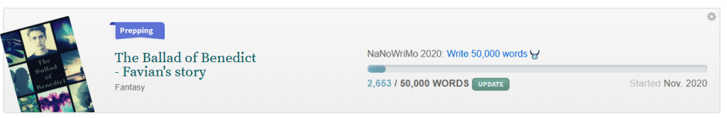 For the month of November, I shall be casting aside The Sins of Silas, and continuing with another work-in-progress, The Ballad of Benedict. This novel has two point of view characters and one of them is halfway completed. The other, I haven’t even begun yet. That storyline shall be my NaNoWriMo project.