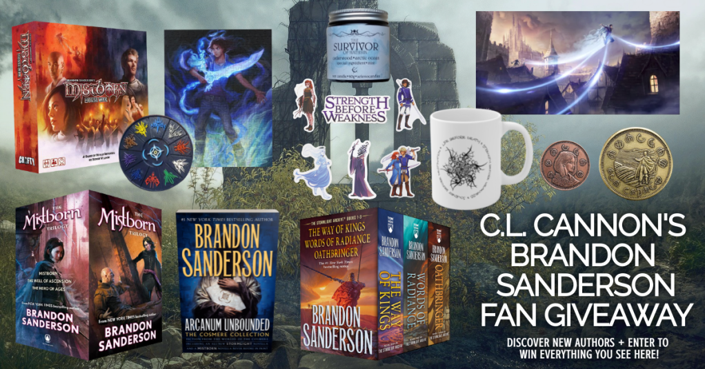 Follow some amazing authors across the web and enter to win a Mistborn 3-book box set, The Stormlight Archive 3-book box set, and Arcanum Unbounded, plus, a Mistborn adventure game, a Kaladin Stormblessed jigsaw puzzle, a Mistborn art print, a Knights Radiant Order display disk, two Coins of Elendel, a Stormlight Archive mug, a Survivor of Hathsin candle, and a Rhythm of War sticker pack!